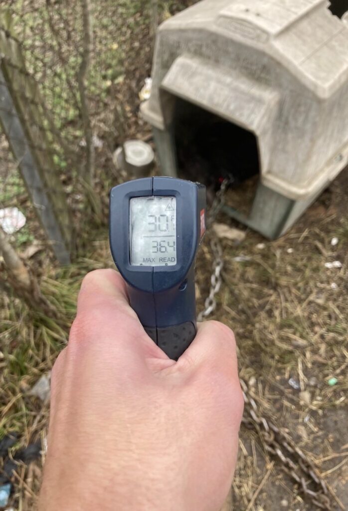Authorities also discovered a fourth deceased dog on the property. An infrared thermometer recorded a surface temperature of 30 degrees at the time of the rescue, confirming the freezing conditions present.